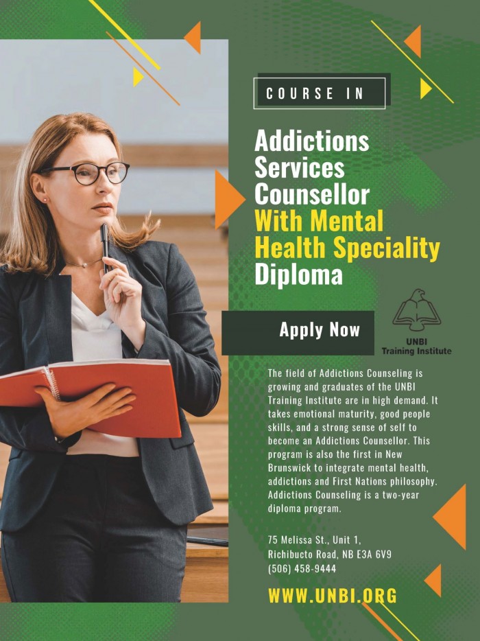 The field of addictions counselling is growing and graduates of the UNBI Training Institute are in high demand. It takes emotional maturity, good people skills and a strong sense of self identity to become an addictions counsellor . The program is also the first in New Brunswick to integrate mental health, addictions and First Nations world view. Addiction Counselling is a two-year diploma.